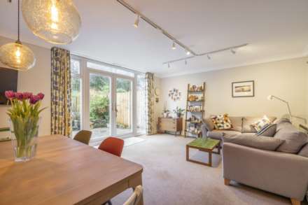 At the rear, the bright living room/dining room is flooded with light from its large glazed doors bringing views of the beautiful garden in. It is a substantial space that stretches the width of the house with plenty of room for separate zones for relaxing, dining and entertaining in.
