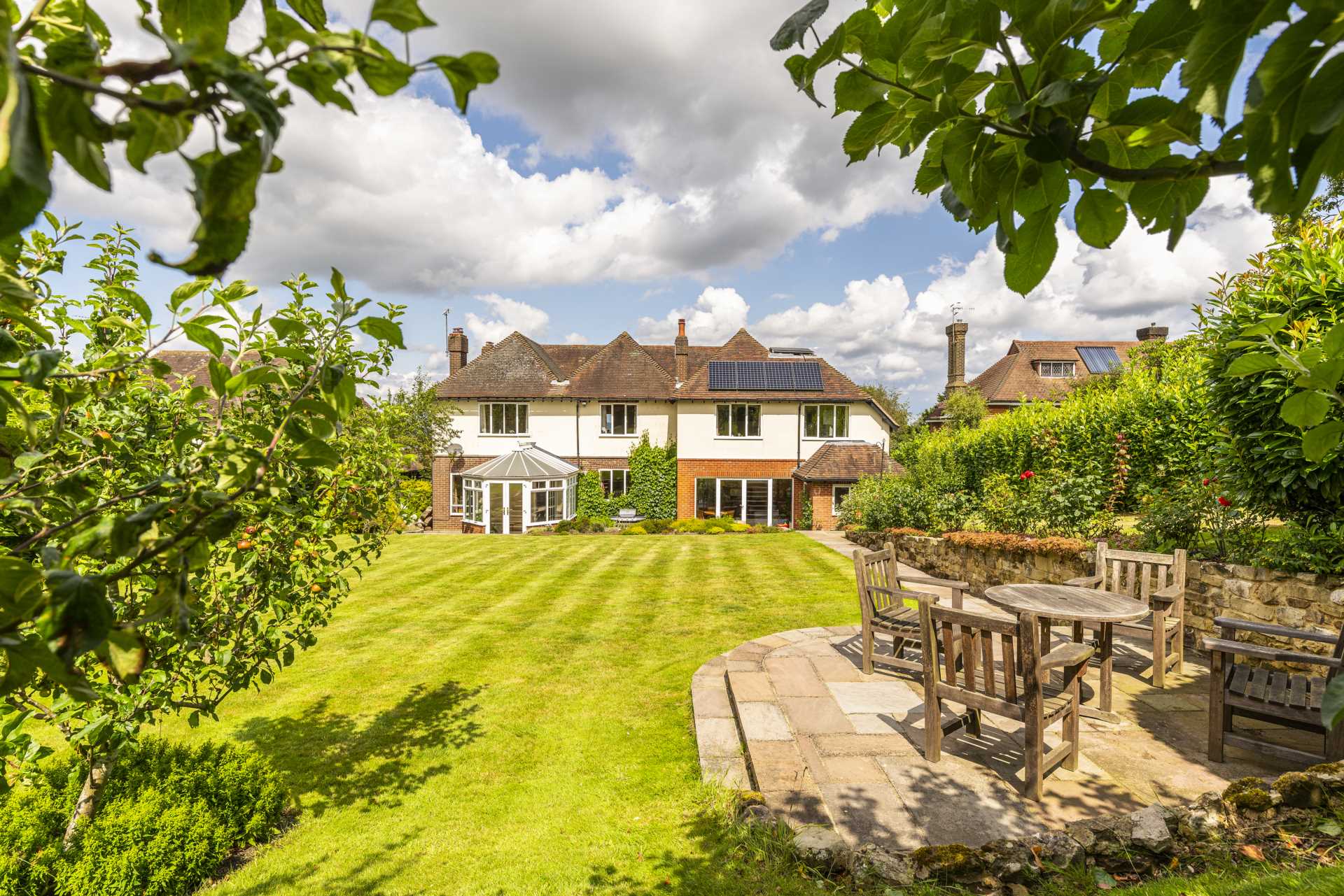 Opening to the rear is the conservatory with wrap around windows drawing in light and views of the beautiful garden. It is the perfect space for relaxing in the sun and a set of French doors open onto the terrace and garden beyond.