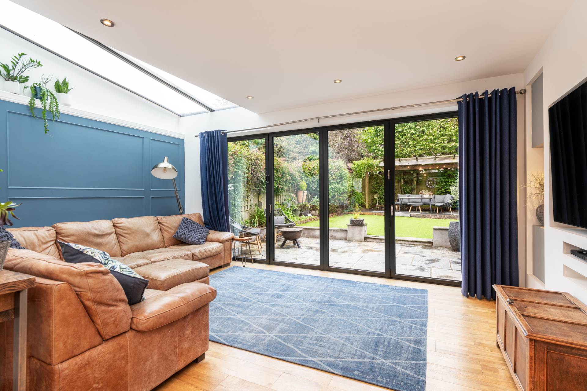 The family room that opens to the rear delights in garden views with bi fold doors and a part glazed roof flooding the space with light. Recessed wall shelves with lighting add character and there is ample room for large family sofas.