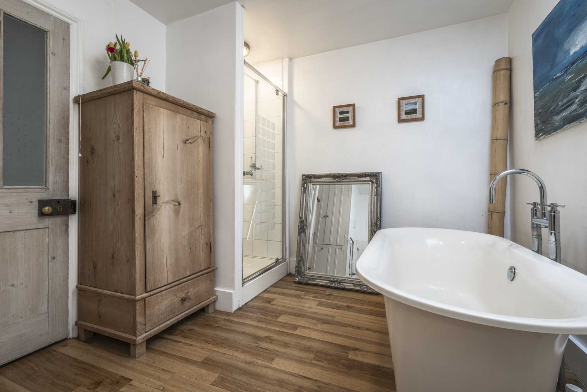Bathroom: rear aspect window, freestanding double ended roll top bath with floor standing bath mixer tap, pedestal wash hand basin with mixer tap, shower cubicle with wall mounted shower attachment, fitted cupboard housing the water cistern, radiator, wooden flooring, and part tiled walls.