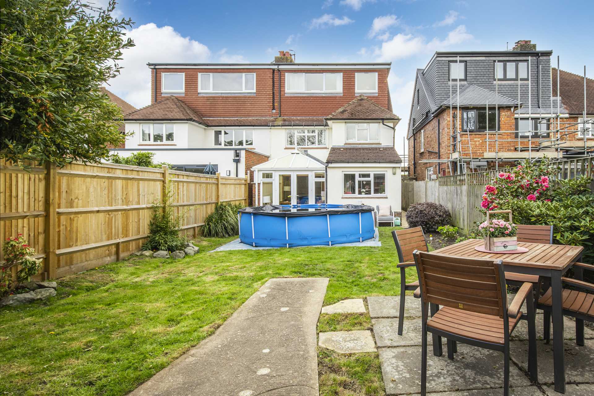 Outside the garden is fully enclosed offering a safe sanctuary for children and pets, with plenty of room for a table and chairs on its paved terracing. There is an area of lawn, stocked flower beds, two wooden sheds and side street access. It has the added advantage of planning permission for a garden treatment room, should your needs require it.