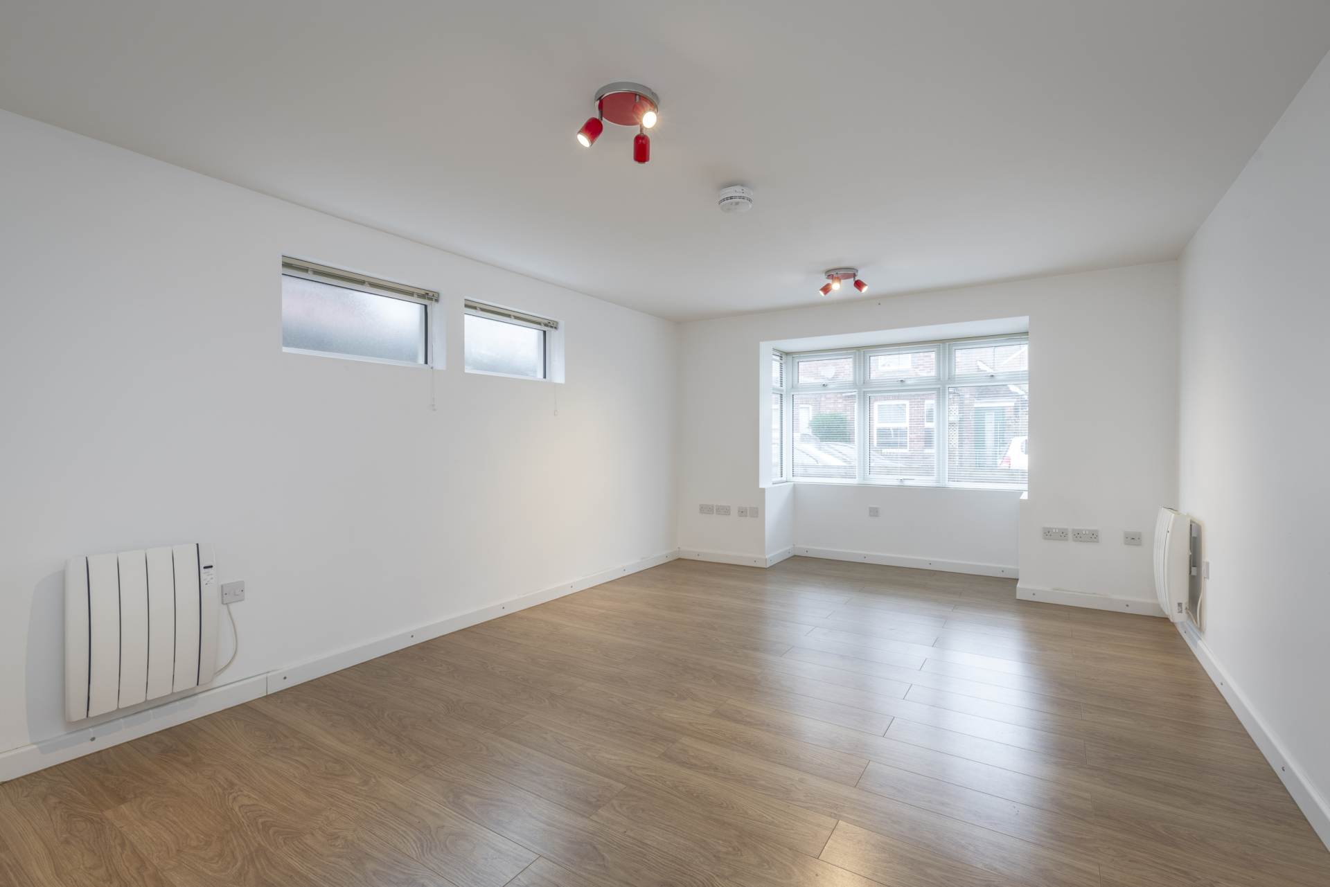 Living Room: front aspect double glazed bay window, side aspect opaque double glazed windows, wooden effect flooring, electric heater.
