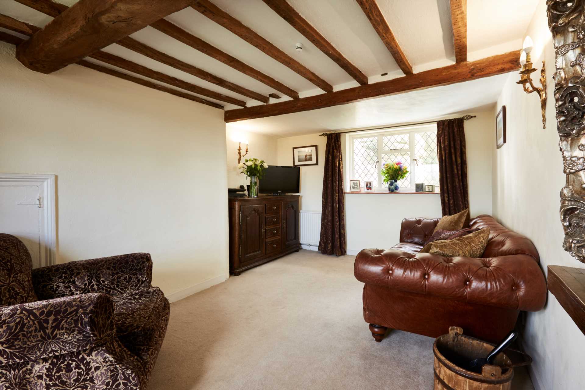 On the right is the living room which delivers fabulous relaxing and entertaining space steeped in history with its exposed ceiling beams. Its windows bring in a mix of open countryside and church views at either end whilst a wood burning stove adds warmth to the room as you curl up in a deep sofa on cold winter nights.