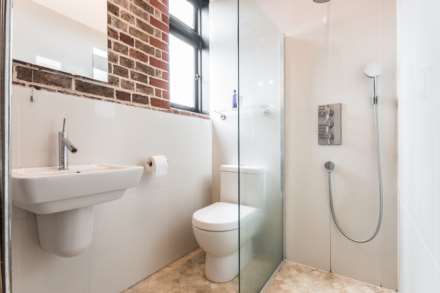 Kitchen/Breakfast Room: 12'4 x 11'3' front aspect windows, stainless steel 1 ½ bowl sink with drainer and Philippe Starck mixer tap, tiled flooring, integrated appliances: Smeg washer/dryer, Bosch dishwasher, Bosch fridge/freezer, Bosch electric oven, Bosch 5 ring gas hob with Bosch stainless steel extractor above, Bosch microwave and radiator. The kitchen has plenty of worktop space and a good selection of eye and base level triple gloss wooden effect Howdens units, some opaque glazed, with a fitted wine rack. The Bosh boiler is concealed in a wall hung cupboard and there are exposed brick walls.