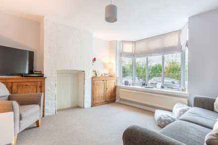 At the front of the house is the spacious living room with a deep square bay window flooding the room with light. There is ample space for sofas and two wooden alcove cupboards add charm and character to the room.