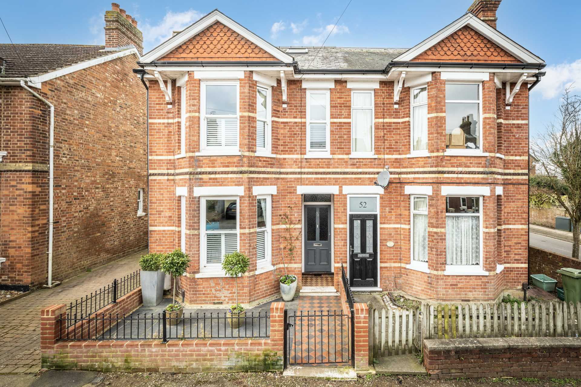 Its handsome red brick exterior is set back from the road by a low wall and metal railings with smart tiling and planting behind. A chequered pathway entices you up to its canopied porch.