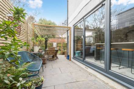 Outside the garden is fully enclosed offering a sanctuary for children and pets, with plenty of room for a table and chairs on its paved terrace, which is shaded by its wooden pergola, making it perfect for summer dining. There is an area of lawn, wooden shed and an L shaped wooden bench providing extra seating and storage.