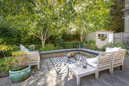 The enclosed private west facing garden, at the rear, has been well thought out and delivers on every level with a paved terrace with fitted seating, a fantastic outdoor kitchen with bar, a neat lawned area and even a vegetable patch. Stocked flower beds and shrubbery dotted about add interest whilst a wooden shed offers storage. This sunny garden is fully enclosed by wooden fencing and mature trees and hedging which afford great privacy. There is off street parking to the front and a covered car port.