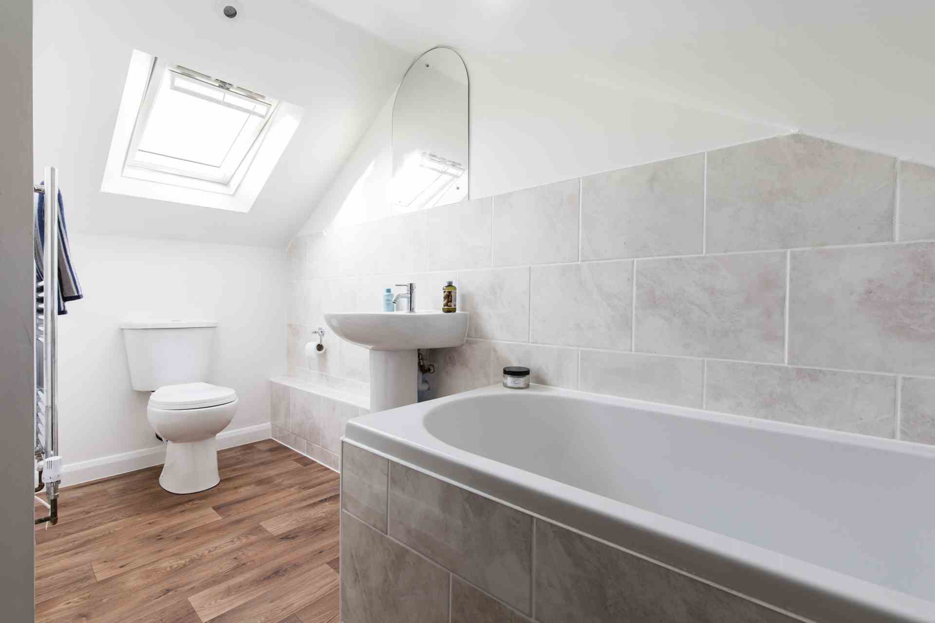 En Suite bathroom: 11'10 x 12'10' with ceiling velux window, under eaves storage cupboard, panel enclosed bath with mixer tap and hand held shower attachment above, low level WC, pedestal wash basin, heated towel rail, part tiled walls and laminate wooden flooring.
