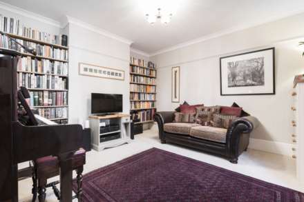 Reception 1/Living room: 11'10 x 12'10' into double glazed front aspect window overlooking the street, fitted book shelving in both alcoves and radiator.