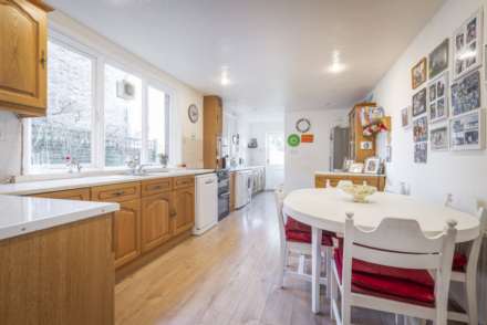 At the end of the hallway, is the kitchen/breakfast room with generous proportions that make it a very social space, its open plan layout letting you chat to friends and family as you prepare dinner. Windows to the side and a part glazed door at the rear bring in light and garden views with wooden cabinets topped with contrasting wooden work tops wrapping round the room and providing housing for freestanding appliances.