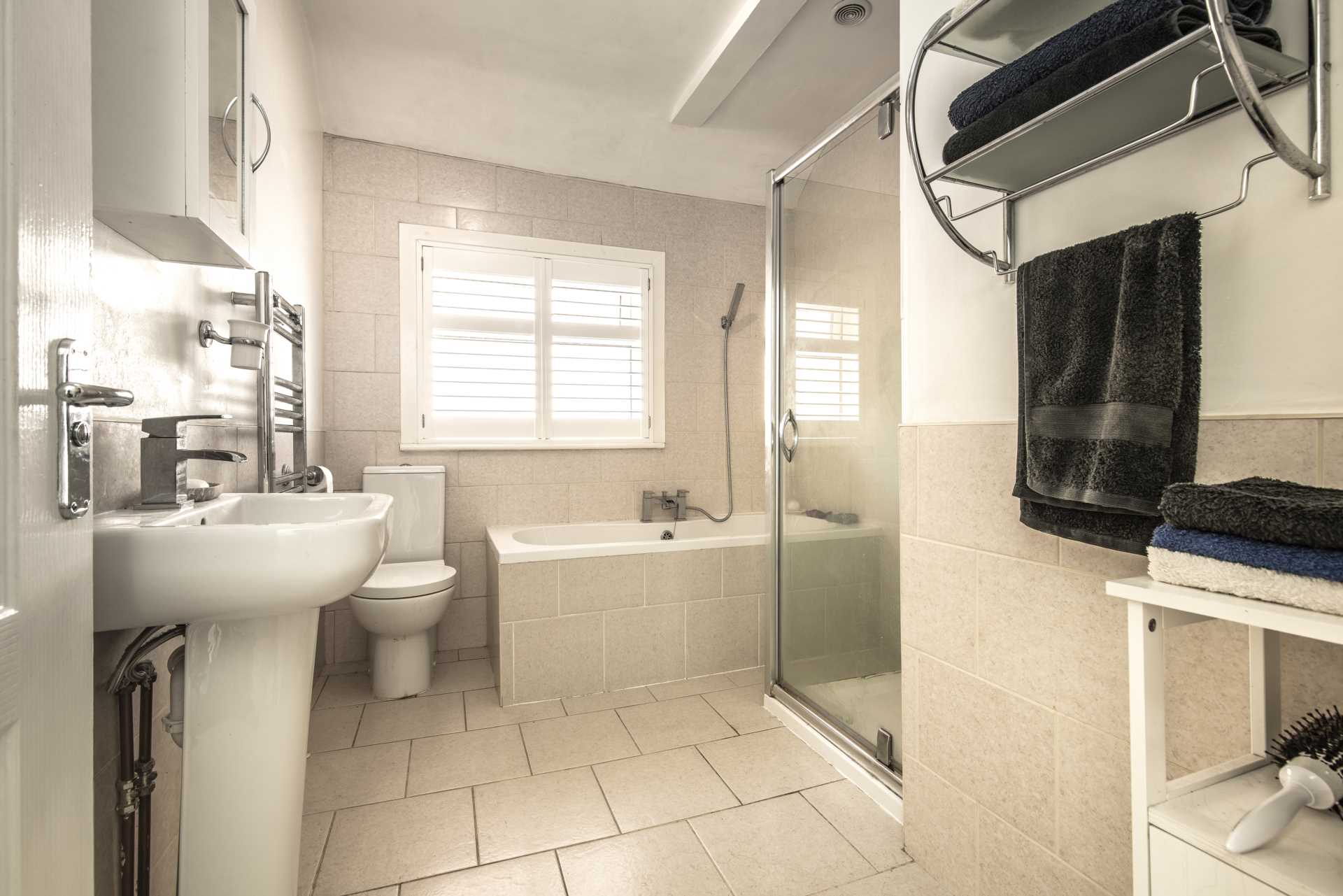 The family bathroom is fresh and modern with a shower cubicle with rainwater shower head and tiled panel enclosed bath. A side aspect window reflects light off its white fittings and contemporary tiles for a soothing bathing experience.